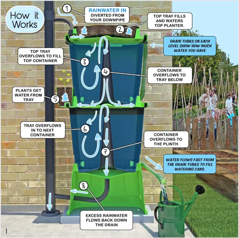 Its unique patented modular design incorporates an integrated plant growing system enabling plants and herbs etc. to grow alongside the stored rainwater.