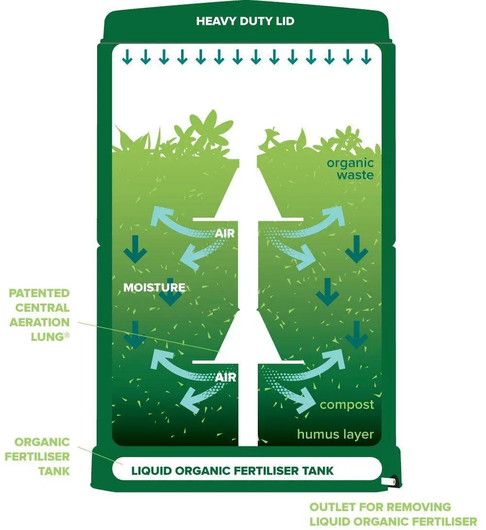 - Has a moisture recirculation system, which means you can just drop your food/garden waste in and let the Aerobin get to work!